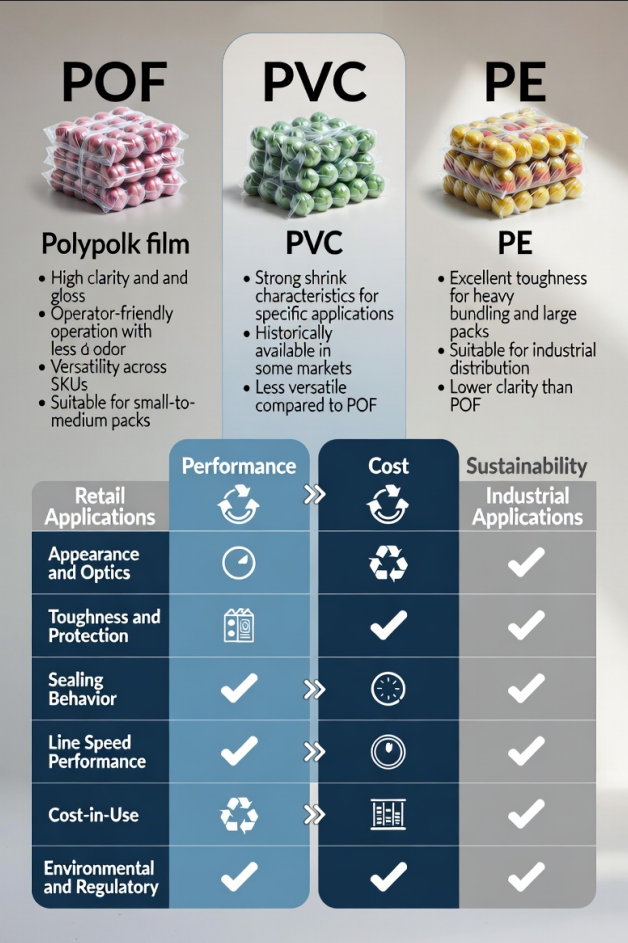 In vielen modernen Verpackungsbetrieben wird POF als vielseitigere und weithin akzeptierte Lösung für Einzelhandelsverpackungen und Umgebungen mit gemischten Produkten gewählt.